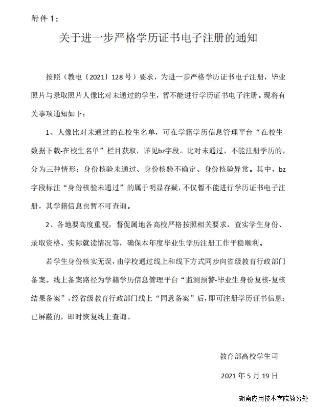 教育部高校学生司近日下发《关于进一步严格学历证书电子注册的通知》(见附件1),要求按照(教电[2021]128号)文件精神进一步严格审核学历证书电子注册信息,凡毕业照片与录取照片人像比对显示“身份核验未通过”和“身份核验不确定”的学生暂不能进行学历证书电子注册。其中,“身份核验未通过”的学生不仅暂不能进行学历证书电子注册,其学籍信息也暂不可查询,同时也不能发放学位证书。经比对我校现有252名学生身份核验未通过(名单见附件2)。请各教学院接本通知后及时告知身份核验未通过的学生,并敦促其须于6月5日前提供以下佐证材料,由学校上报省教育厅再次申请审核。若未按要求提供材料者,将无法进行学历证书电子注册,自己将承担不能按时取得学历、学位证书的责任。
