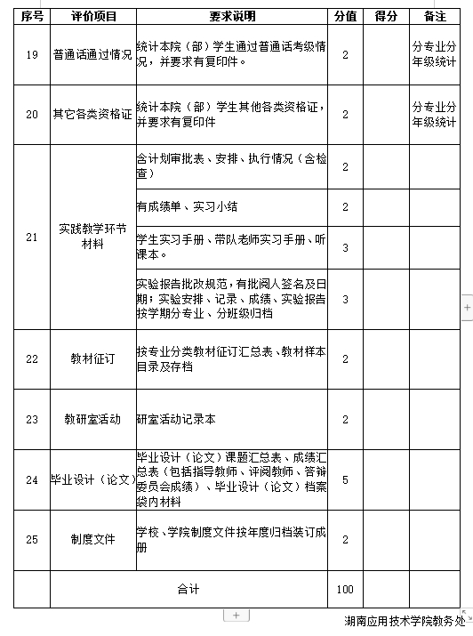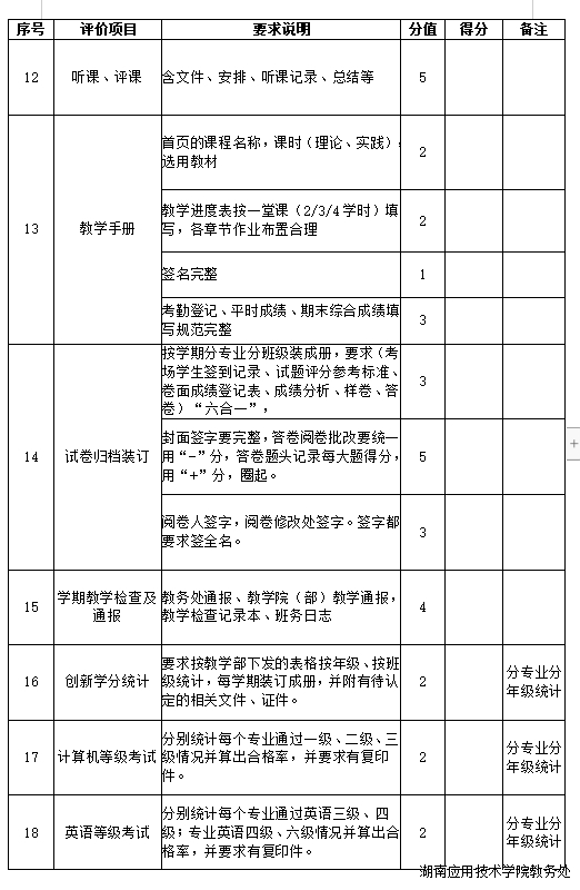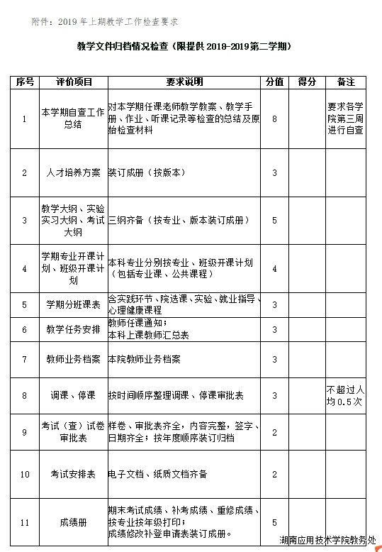 为了进一步加强教学管理规范化建设,促进教学过程管理精细化、规范化,教务处将于本学期第10周对各教学院(部)2018-2019学年第二学期教学文档的归档情况进行一次专项检查。检查内容和要求见附件,请各教学院(部)高度重视,认真准备。