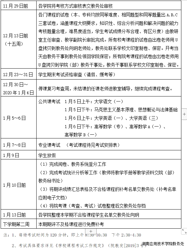 2019年12月27日结束本学期新课;12月30日~2020年1月4日复习和集中考查,1月4日前完成所有考查科目的考核;1月5~8日期末集中考试,其中1月5~6日为公共课考试时间,1月7~8日为专业课考试时间。